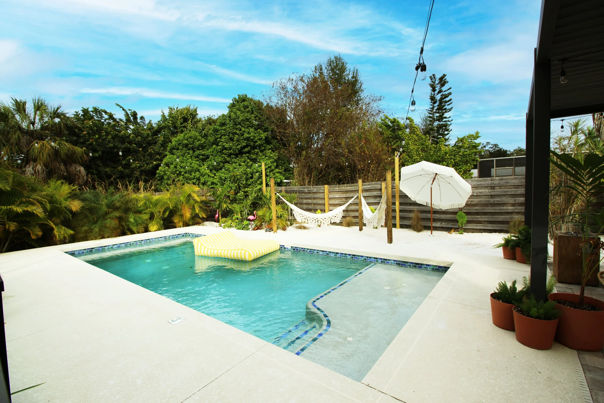 This spacious, 3-Bed/2-Bath oasis blends modern style with tropical vibes in an open-plan layout perfect for groups and families. Challenge someone to ping pong or test your skills on the arcade loaded with thousands of games. Dip into the pool, dine al fresco under cafe lights, or sway to sleep in hammocks on your own sandy beach area!